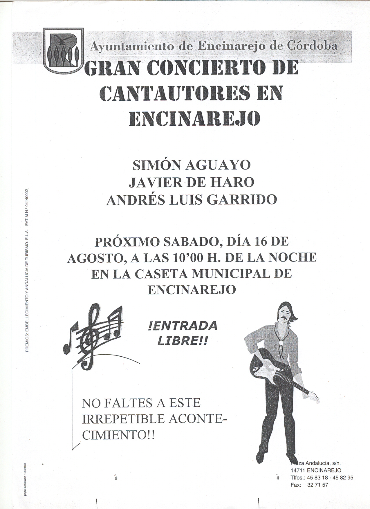 El 11 de julio de 2001 el Ayuntamiento de Guadalcázar organizó el I Encuentro de Cantautores, al que fuimos invitados. En él actuamos Alberto Guerrero, Javier de Haro, Antonio Prieto y yo, acompañado por mi hija Clara.